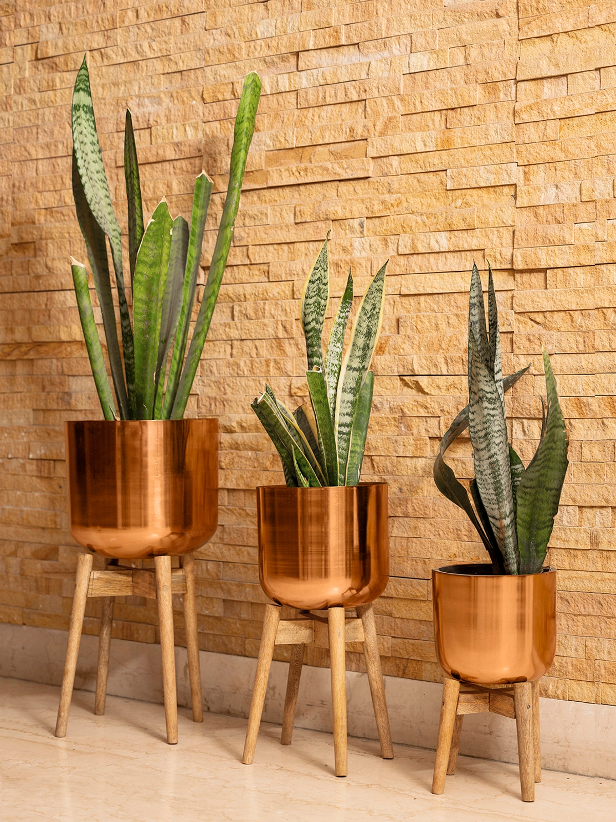 Elevate Your Space with Our Set of Three Copper Pots with Wooden Stands